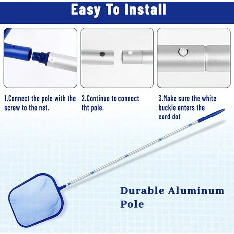 【Einfache Installation】 Die Aluminiumstange besteht aus 5 Verbindungsabschnitten. Der Poolkescher wird mit einem Knopfdruck an einer geeigneten Stange befestigt.