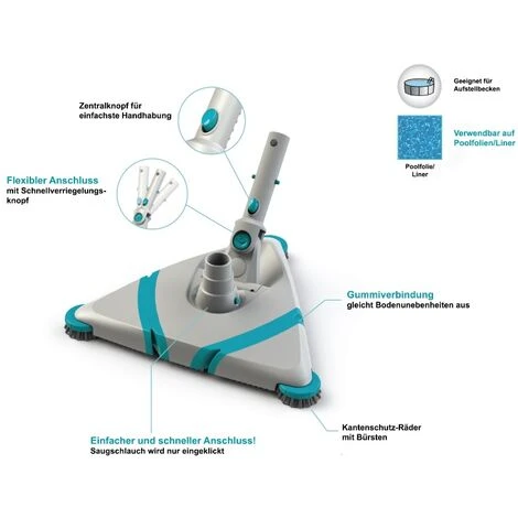 Das Bodensauger-Kopfteil ist dank seiner dreieckigen Form ideal für Aufstellbecken und passend für alle handelsüblichen Teleskopstangen. Der einklickbare Saugschlauch und der Schnellverriegelungsknopf ermöglichen einen schnellen, einfachen und flexiblen Anschluss. Durch die Gummiverbindung, die Bodenunebenheiten ausgleicht, ist es für Poolfolien/Liner bestens geeignet.