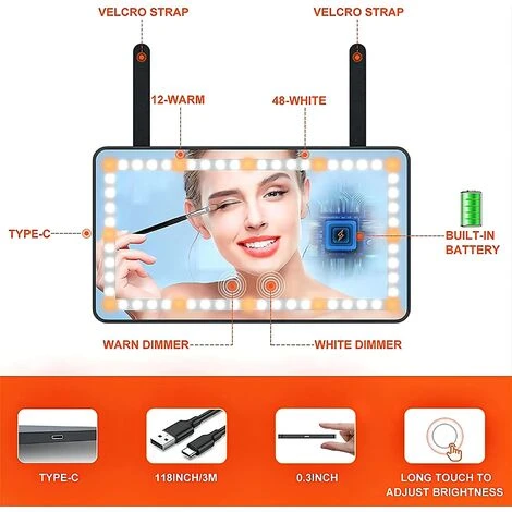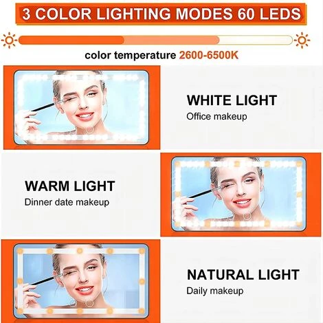 ?��DIMMBARE ZWEIFARBIGE LED-LEUCHTEN��- Der Auto-Schminkspiegel hat 12 gelbe Lichter und 48 wei?e Lichter, das sind 40 % heller und 60 % weniger Energie als normale Gl��hbirnen. Dr��cken Sie kurz die 2 Sensorschalter, um die Lichtfarben zu ?ndern: Wei?, Gelb, Wei? und Gelb. Lange dr��cken, um nach Bedarf zu skalieren. Die Farbtemperatur von 2500-6500K entspricht dem Sonnenlicht im Freien, das Make-up ist nat��rlich nicht anders.