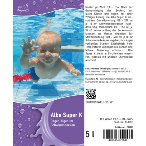 Nach der Grundreinigung das Becken, vor allem Kanten und Fugen, mit einer 20%igen Lösung von Alba Super K einspritzen. Grunddosierung: 150 – 200 ml je 10 m³ Schwimmbadwasser. Nachdosierung: Wöchentlich 100 – 150 ml je 10 m³. Immer entlang des Beckenrands langsam ins Wasser eingießen. Zur Stoßbehandlung: 300 – 400 ml je 10 m³ Schwimmbadwasser zugeben, falls Algen vorhanden. Starker Badebetrieb, hohe Temperaturen und Regenfälle können eine
