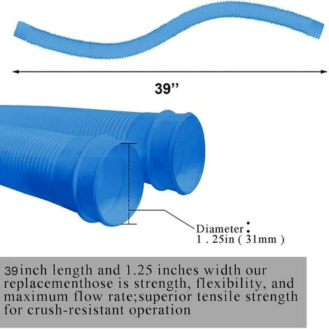 Ersatzschlauch für oberirdische PoolsZubehör-Poolpumpen-Ersatzschlauch Feature: Unser Ersatzschlauch für Schwimmbecken besteht aus flexiblem Polyethylen-Kunststoff, der auslaufsicher, extrem langlebig, starr, leicht und flexibel sowie von hoher Qualität ist. Klares Material, damit Sie es leicht haben. Unser Poolfilter-Ersatzschlauch kann mit allen Filterpumpen 330 GPH, 530 GPH und 1.000 GPH Krystal Clear Cartridge Pump Filters und Salzwassersystemen wie 607, 637 kompatibel sein. Filtervakuum zum Sammeln von unerwünschtem Schmutz und Ablagerungen für klares und sauberes Wasser. Mit einem zuverlässigen Pool-Vakuumschlauch können Sie sich beruhigt zurücklehnen, während Sie Ihren Pool warten. Einfach in wenigen Minuten zu installieren, verwenden Sie einfach einen Schraubendreher und eine Zange, kein zusätzliches Zubehör erforderlich. (Bitte beachten Sie: Schraubendreher und Zange sind nicht im Lieferumfang enthalten.) Familie und Freunde spielen glücklich mit dem Wasser. Die Länge der Wasserleitung beträgt 1 Meter, 39,3 Zoll, der Durchmesser beträgt 32 mm, 1,25 Zoll. Paket beinhaltet: 2x Ersatzschlauch 1x PTFE BAND