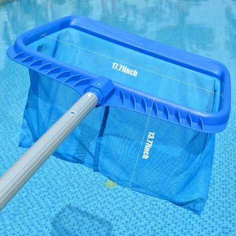Der langlebige, mit PVC-Pool-Skimmer-Netz überzogene Rahmen hat eine abgeschrägte Vorderkante, die das Gleiten und Manövrieren am Boden des Pools erleichtert und gleichzeitig zusätzliche Schöpfkraft bietet schnellere und einfachere Poolreinigung, da auch eine größere Menge an Blättern und Schmutz auf einmal gesammelt wird, wodurch Sie Zeit und Mühe bei der Reinigung sparen.