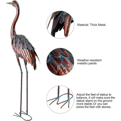Die stehende Kranich-Statue wird mit einem Clip geliefert, der in zwei in die Füße geschweißte Schnallen passt, um sie zu halten auf dem Boden. Stabiler.