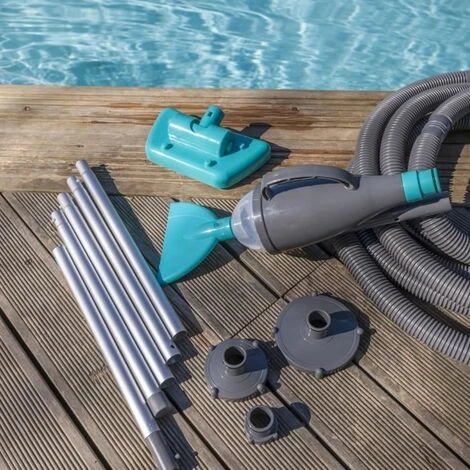 Mittlerer Staubsauger für Pool- und Spa-Bodenreiniger Bürstenabsaugung, normaler manueller Bodenreiniger, 2,16 m Aluminiumstange (6 Teile), 3 Anschlüsse (groß, mittel und klein), 9 m 32 mm flexibler Schlauch