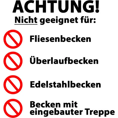 ACHTUNG! Keine Eignung besteht für Überlauf,- Edelstahl,- Fliesenbecken, sowie Becken mit einem Luftring oder einer eingebauten Treppe.