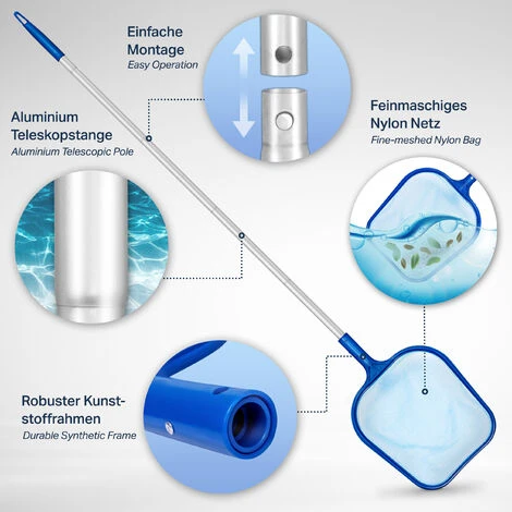 Durch die spezielle Bauform eignet sich der Kescher perfekt für die Reinigung der Wasseroberfläche. So wird Schmutz wie Blätter, Insekten und Pollen effektiv aufgenommen werden, sodass das Wasser in kurzer Zeit gesäubert wird.