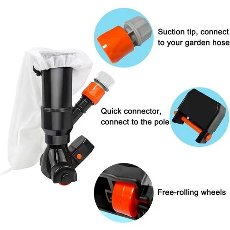【Einfach zu bedienen】 – Kein Filtersystem erforderlich, Teile sind miteinander verbunden und kein Werkzeug erforderlich, 2 Räder erleichtern das Manövrieren des Staubsaugers entlang des Beckenbodens, ganz einfach zu installieren und einfach an jeden Standard-Gartenschlauch oder Vakuumschlauch anzuschließen.