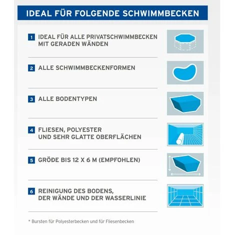 für alle Beckentypen geeignet (Fliesen, Folie, Polyester, verstärktes PVC und gestrichener Beton)